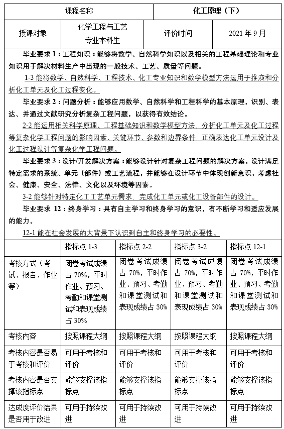根据《工程教育认证标准》的相关要求,确定了作为核心支撑课程--化工原理的教学目标,设置了相应的复杂工程问题作为教学示例和课后练习,所有实践环节提供的实习项目必须具有较高程度的复杂性和综合性等。教学目标涵盖学生学习的广度、深度,能力培养、解决复杂问题的能力,人生观、价值观,学习能力的培养等。根据新的教学目标,制定出了新的化工原理教学大纲。