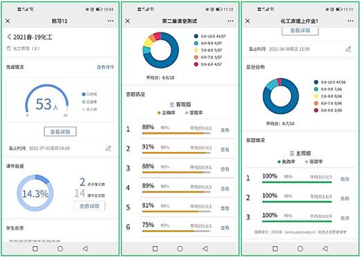 课堂教学适时引入探究式、讨论式、启发式等教学方法,营造以“学生为中心”师生互动、生生互动的课堂。在当前的“互联网+”背景下,我们将化工原理课程从传统的线下教学改为线下线上结合的混合式教学。教师通过采用各种智慧教学云平台,可以有效达成教学目标。目前,我们主要采用雨课堂作为线上平台,课前通过雨课堂发布预习课件,教师根据学生雨课堂的预习数据,可以实时了解学生预习中遇到的问题,从而在线下授课时较传统课堂会更有针对性地进行教学设计;课堂上借助雨课堂开展师生互动,如给学生发布选择题、投票题、填空题和主观题等,通过雨课堂数据可以掌握学生对课程知识点的掌握程度;课后通过雨课堂布置习题并及时批改,教师可以比较准确地掌握学生的实际学习情况。