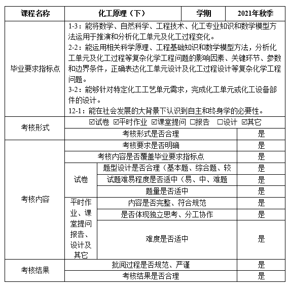 对照工程教育认证标准中的毕业要求,开展化工原理课程的课程体系与教学内容的研究与实践,采用以学生为中心,以成果为导向的化工原理教学改革实践活动,探索出一种创新的课程教学模式,提高工程人才的培养质量,保障化学工程与工艺等相近专业认证的顺利实施,促进我校应用化学、生物工程等相关专业认证的开展,推动高等院校工程学科各类课程在专业认证背景下的教学改革。