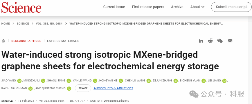 One More Thing:2024年2月15日,北京航空航天大学化学学院程群峰教授、美国得克萨斯大学达拉斯分校Ray H. Baughman教授团队合作在Science期刊发表题为“Water-induced strong isotropic MXene-bridged graphene sheets for electrochemical energy storage”的研究论文,北京航空航天大学2019级博士研究生杨娇、中国科学院理化技术研究所李明珠研究员、美国得克萨斯大学达拉斯分校房少立教授、中国科学院过程工程研究所王艳磊副研究员为论文共同第一作者,Ray H. Baughman教授、程群峰教授为论文共同通讯作者,江雷院士等为论文重要共同作者。
