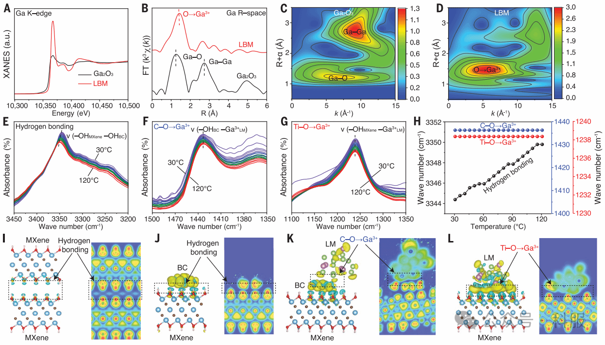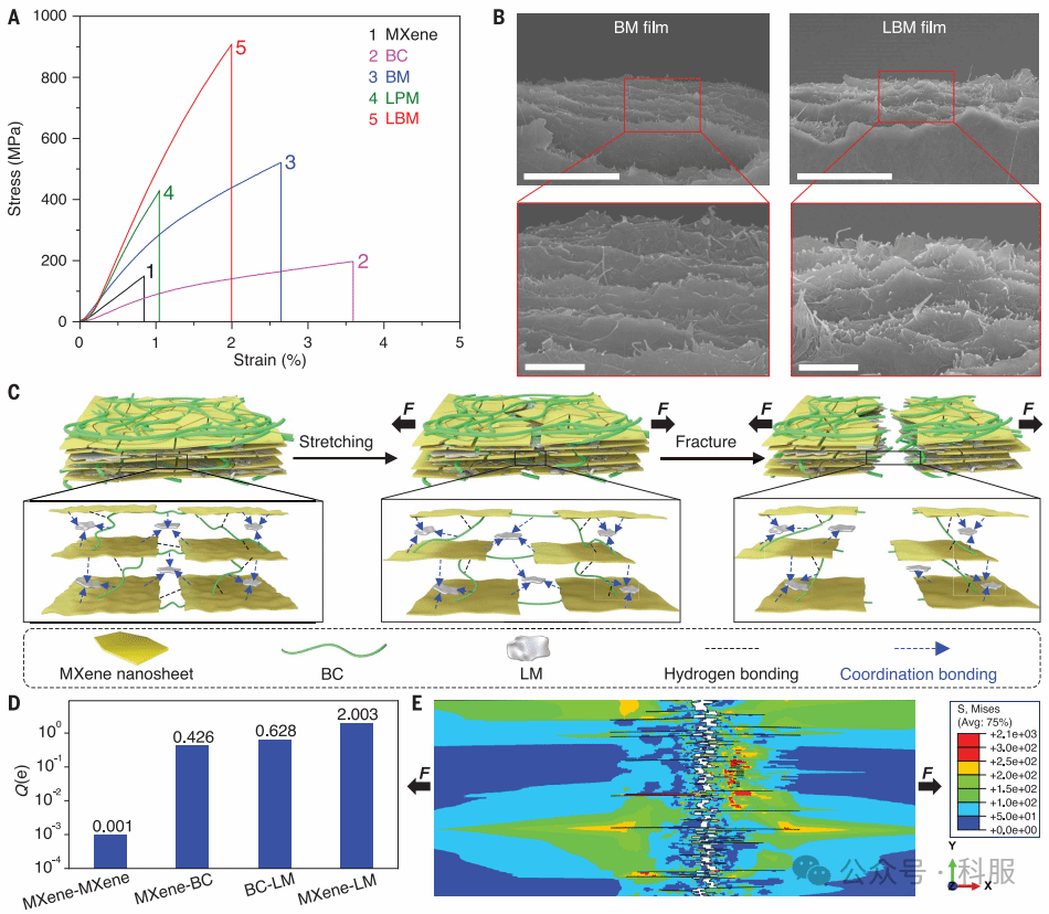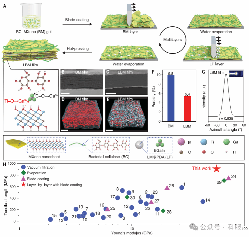 该研究利用液态金属(LM)和细菌纤维素(BC)依次桥接MXene纳米片(LBM薄膜),展示了一种超强宏观MXene薄膜,实现了908.4兆帕斯卡的拉伸强度。采用重复循环的逐层涂覆方法,可将LBM膜的取向度提高到0.935,而具有良好变形能力的LM将孔隙率减少到了5.4%。BC的氢键和LM的配位键增强了界面相互作用,提高了应力传递效率。顺序桥接为其他二维纳米片组装成高性能材料提供了一条途径。