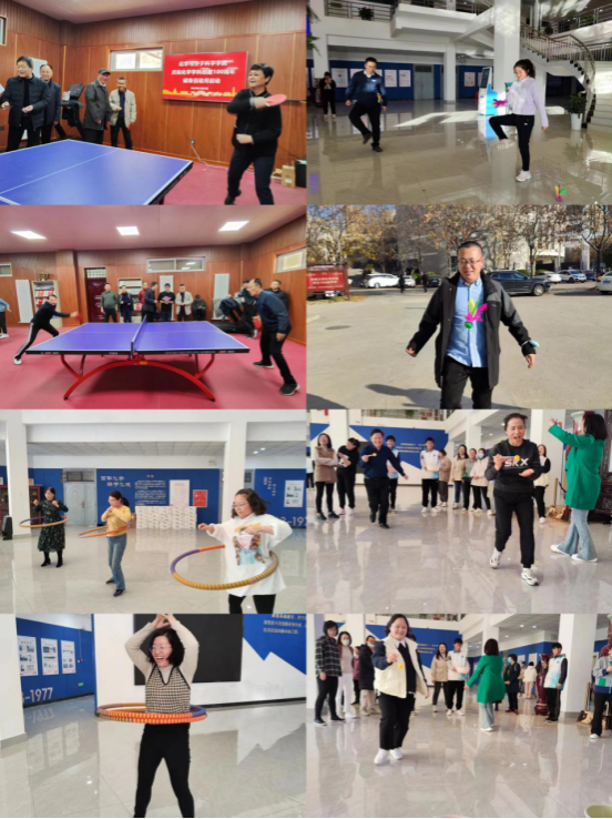 启动仪式结束后,在“职工小家”和学院大厅分别举行了乒乓球比赛和趣味运动会。乒乓球比赛采用淘汰赛制,分为男子组和女子组。趣味运动会设置了呼啦圈、踢毽子和筷子夹运乒乓球项目,计时1分钟,根据完成数目评奖。